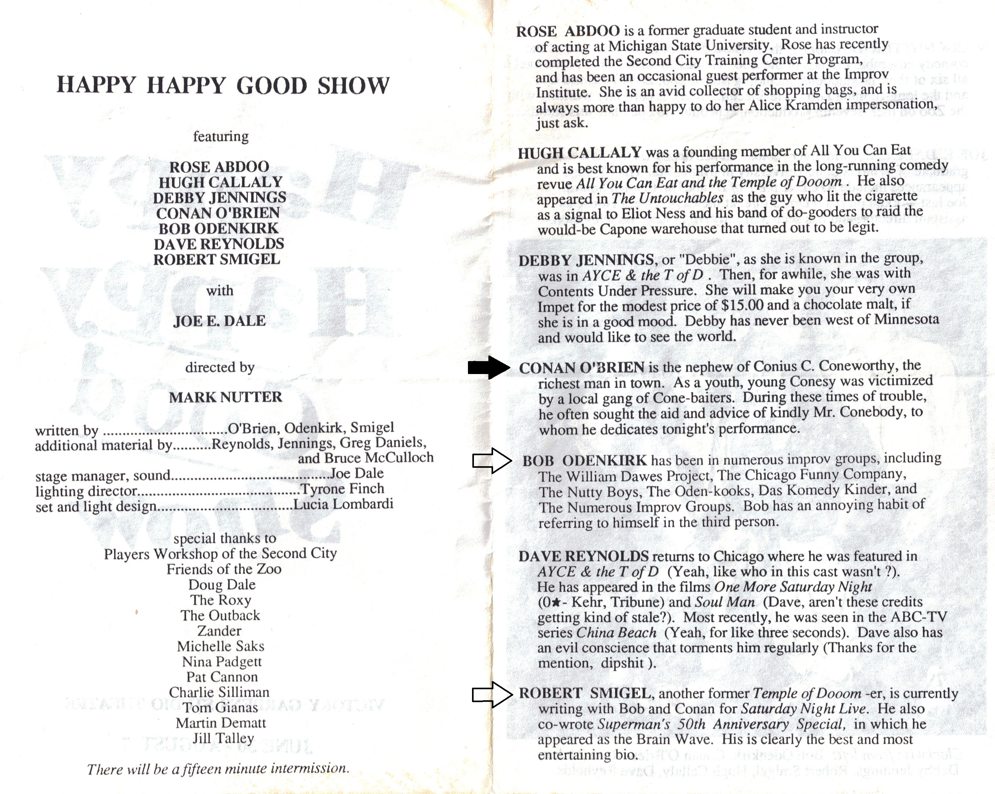 Inside the program (below) you can read Conan’s bio, in which he refers to his rich uncle Conius C. Coneworthy, and the bios of Bob Odenkirk and Robert Smigel which are also highlighted by arrows. In addition to this trio of now well-known performers, several others in the cast have continued their careers in entertainment. Dave Reynolds, in fact, went on to co-write the classic Disney film “Finding Nemo.”