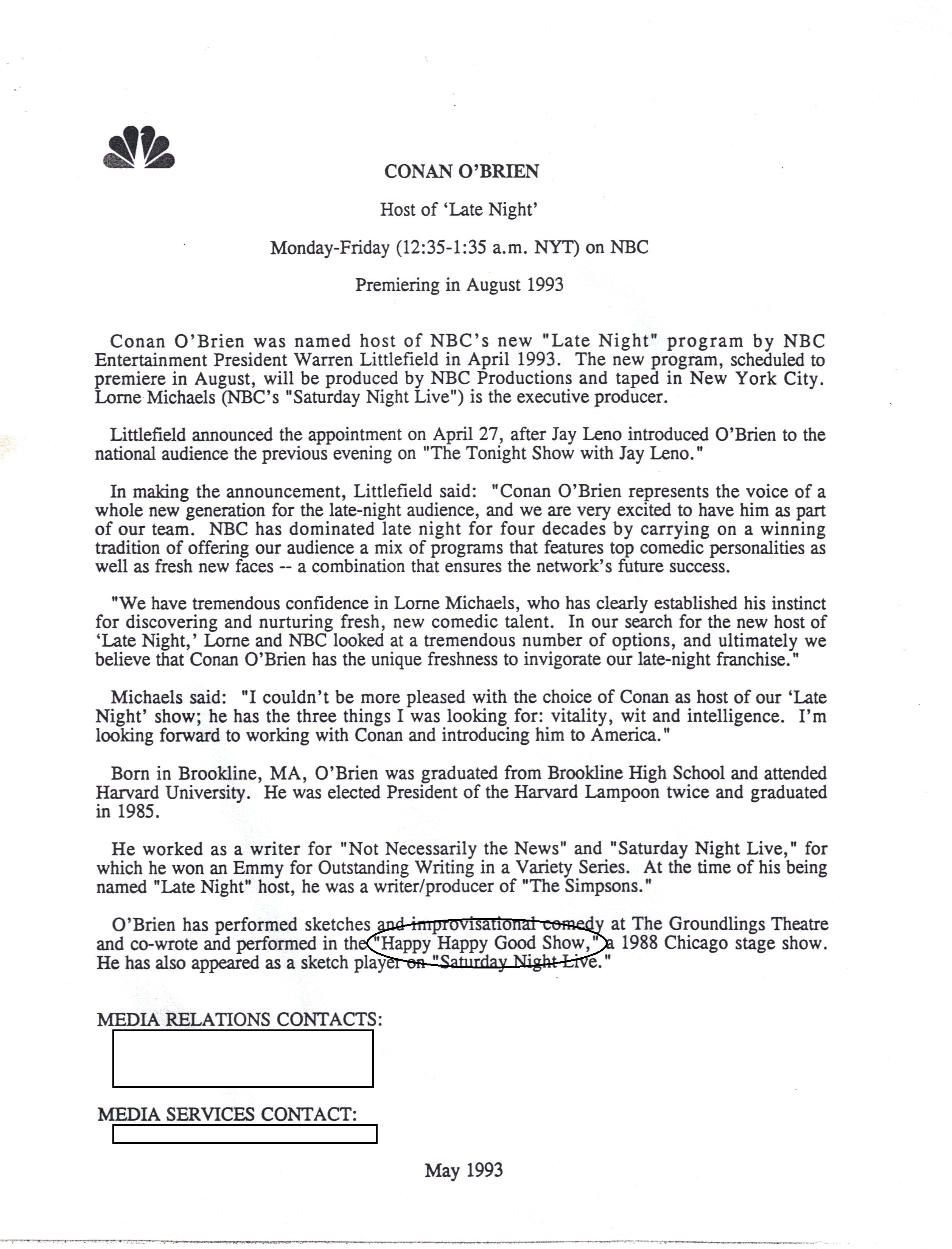 NBC bio given out at the Press Conference introducing Conan O'Brien to the media, May 3, 1993.