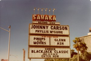 Johnny Carson's name on the marquee at the Sahara Hotel and Casino, Las Vegas, June 1979.